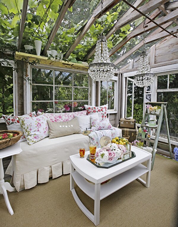 For a wedding present, Heather Cameron’s husband, Kevin, renovated a weathered potting shed on their property into a 10 foot by 12 foot greenhouse. He added 11 windows that he had gathered from a salvage yard to the greenhouse, adding panes to create a tempered-glass roof. Creating exactly what Heather had envisioned, the stunning greenhouse was brought to fruition. Then Heather got down to decorating her new retreat with vintage-floral pillows, white-painted furniture, and collections of mint green jadeite and milk glass vases. Everything she collected for her newly fashioned abode was gathered from Vintage Home, a nearby business that reinvents cast-off furniture and home accessories. “I never had time to use the shed for its original purpose as a place to pot plants,” recalls Heather. “I like it much more now as somewhere to escape to and curl up with a book, paint, or visit with friends.” Via