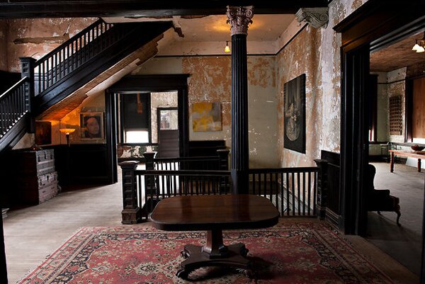 Mr. Hurlbut’s aesthetic design tastes can be described as neo-Gilded Age steampunk. The interiors have been furnished with items picked up from auctions, big castle-type furnishings. Large scale items were sought out to decorate the interiors, since a building of this capacity has such spacious rooms and the ceilings are quite high. The one room that was preserved in its entirety to replicate the Harmony Club was the bathroom on the second floor. The white-tiled communal shower was in keeping with the scale and history, the only addition was a crucifix. Via